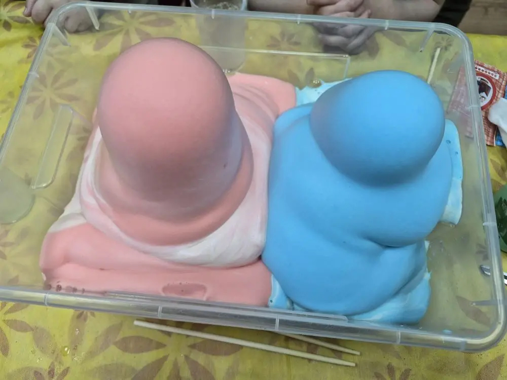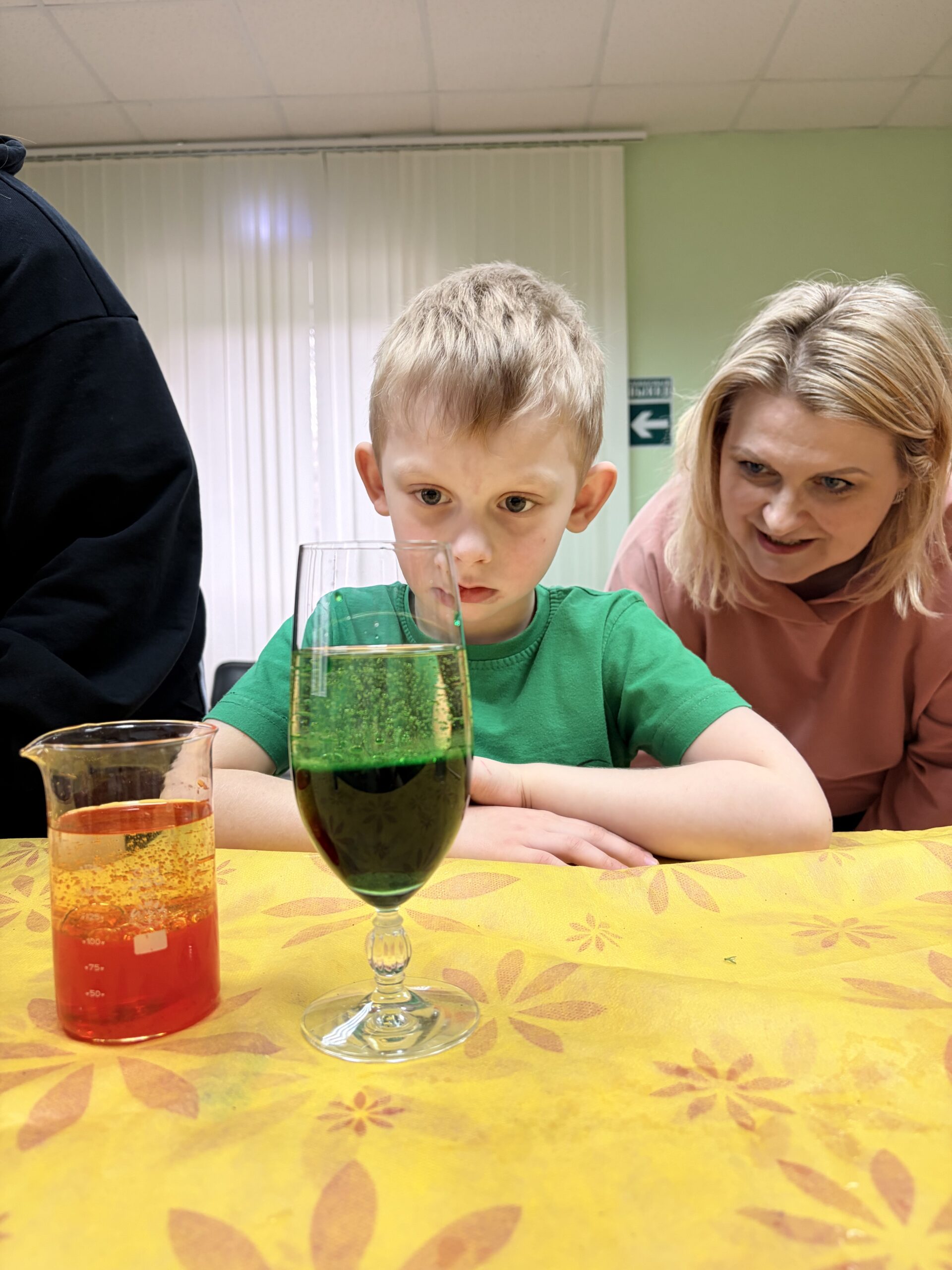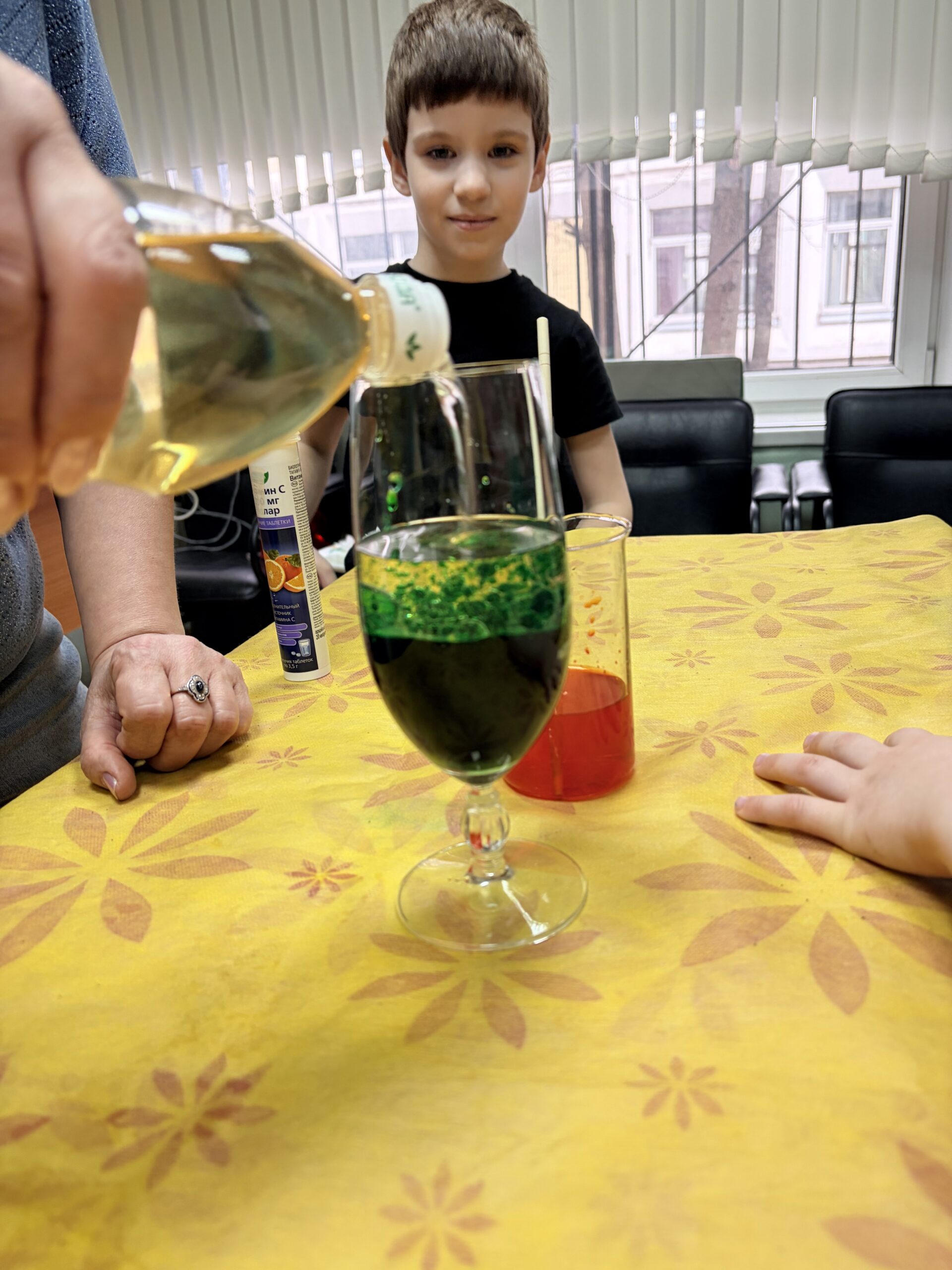 4. «Лавовая лампа». В прозрачной ёмкости смешали воду и растительное масло (масло плавает сверху, так как его плотность меньше). Затем добавили пищевой краситель и шипучую таблетку. Пузырьки газа поднимались и опускались, создавая эффект лавы. Опыт позволил поговорить о плотности жидкостей, а также о том, как разные вещества ведут себя в организме и почему важно выбирать натуральные продукты.