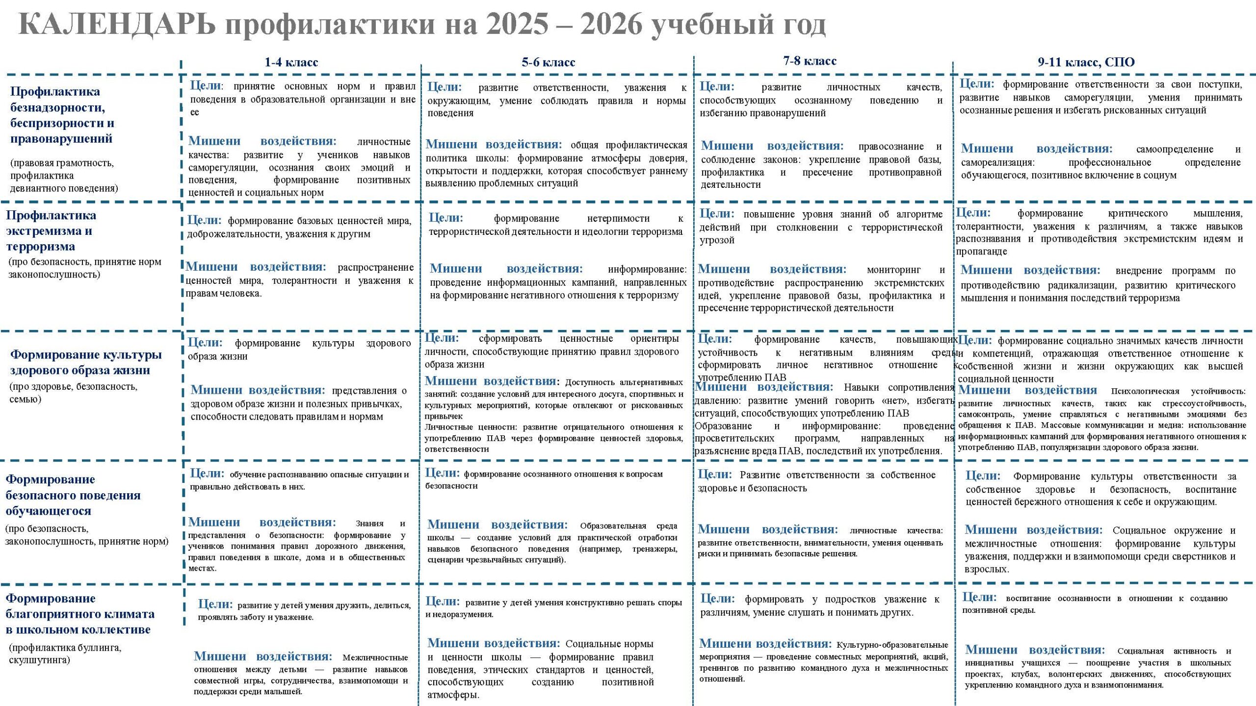 Календарь профилактики позволяет планировать и организовывать мероприятия, которые проводятся, чтобы исследовать особенности и ресурсы современных подростков, разрабатывать и распространять эффективные технологии помощи обучающимся и их родителям.