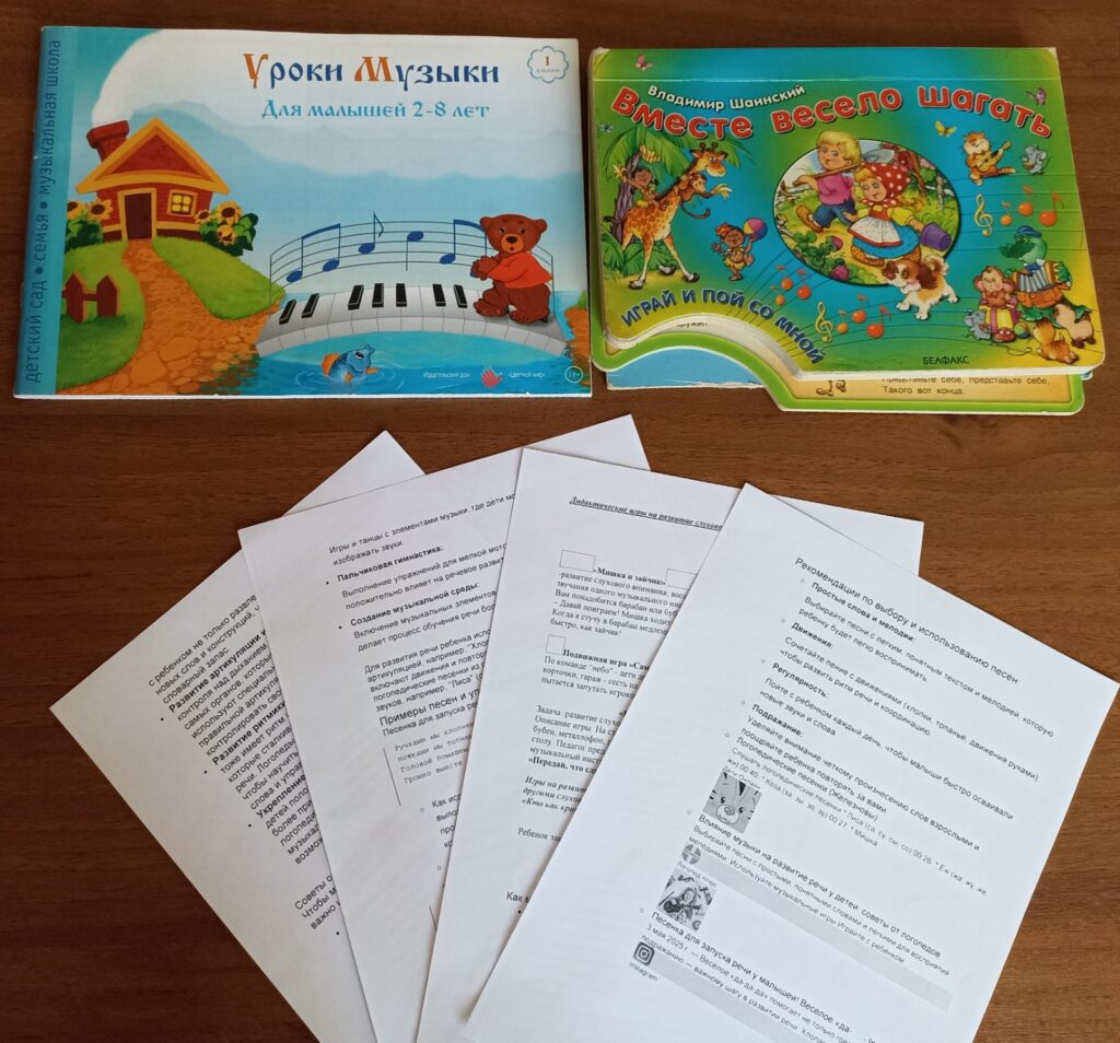 Также родителям были представлены дидактические материалы и рекомендации для развития музыкальной и речевой деятельности детей. В них обращалось внимание на прослушивание разнообразной музыки, содержания простых слов, мелодий, действий (хлопков, притопов), регулярности пения и подражания.