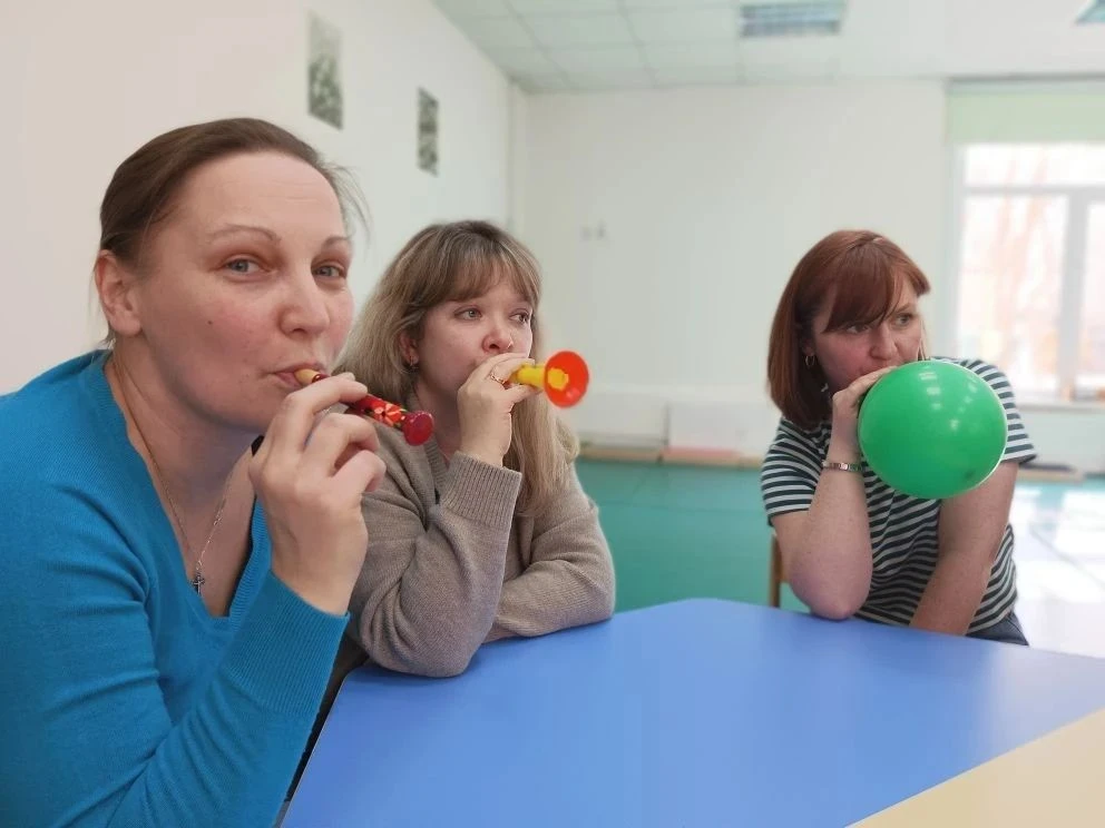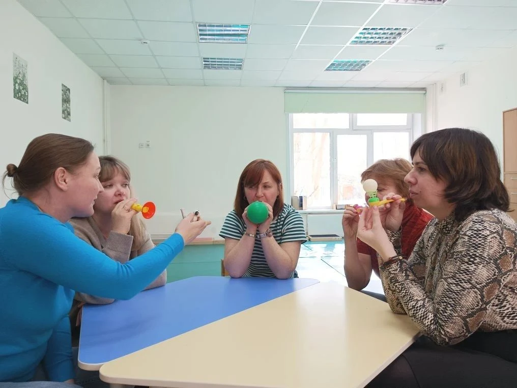 Отдельное внимание уделили развитию речевого выдоха. Упражнения «Проведи шарик по дорожке», «Надуй шарик» и работа с тренажёром «Аэрбол» вызвали живой отклик и положительные эмоции у участников.