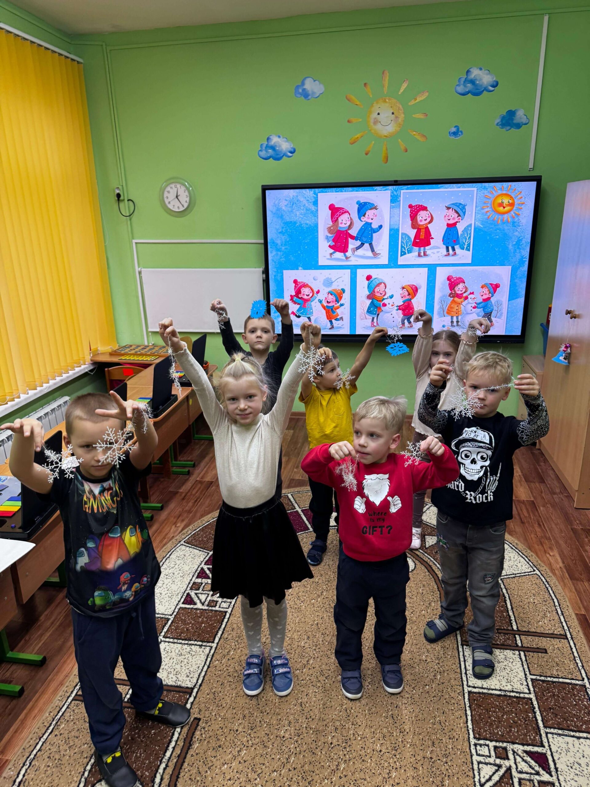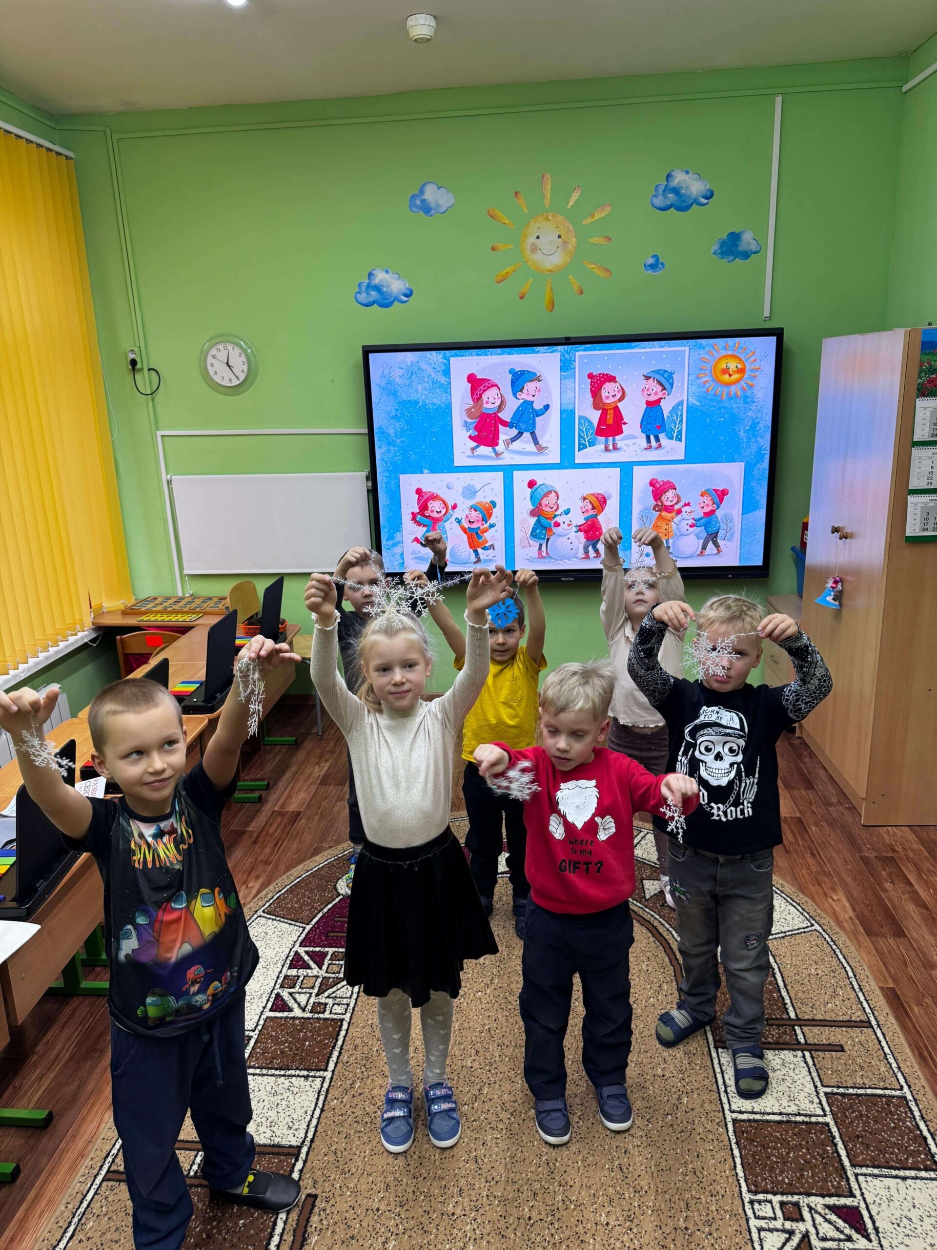 Дети с удовольствием дети лепили (из бумаги) и играли в снежки, оказалось, что это также интересно, как лепить и играть в настоящие снежки, а может быть и ещё веселее. Находили одинаковые снежинки и сосульки, проходили снежные лабиринты и все вместе нарисовали самого веселого снеговика.