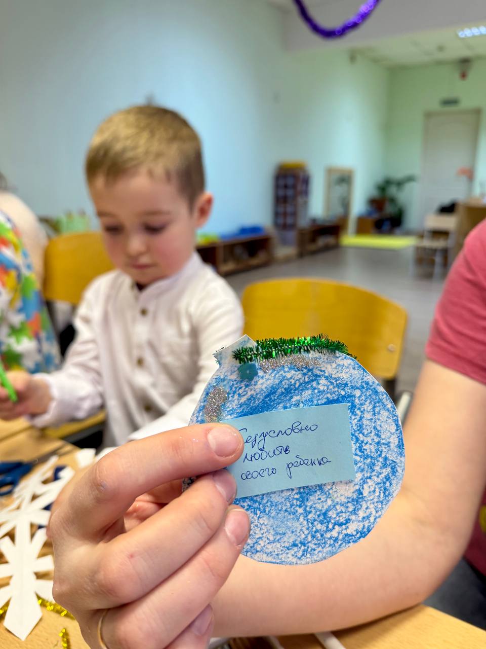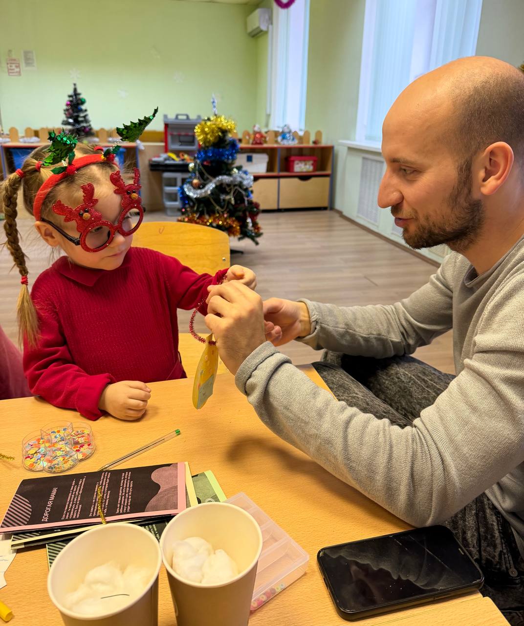 Центральным элементом стал «Сундук с новогодними советами». В разгар праздника дети нашли волшебный сундук, из которого ведущие доставали заготовки для поделок и конверт для родителей. В конверте письмо-поддержка с практическими советами, как сохранить спокойствие и радость в предпраздничной суете.