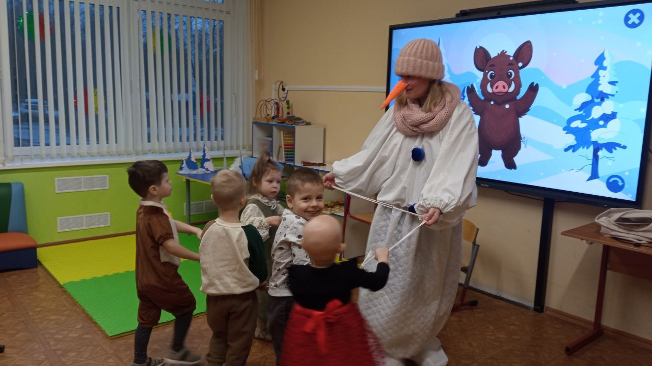 Магия началась с первого момента: в гости к ребятам пожаловал озорной Снеговик, который пригласил всех не просто послушать историю, а помочь ее героям. Дети с радостью откликнулись и превратились в активных участников сказочных событий.