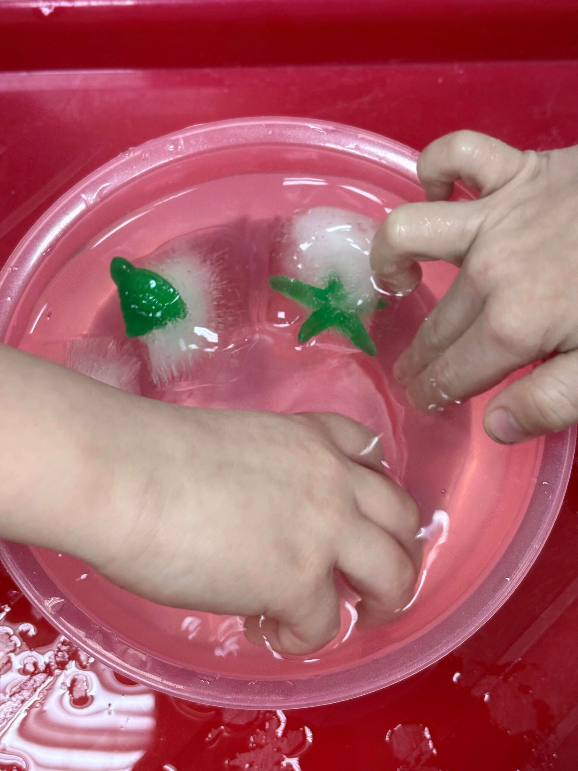 4. «Лед — твердая вода. Кто спрятался во льду». Растапливаем замороженную во льду игрушку. Чем становится лед при нагревании? А как сделать лед дома? Убеждаемся, что лед может таять от тепла. А Вода на морозе застывает.