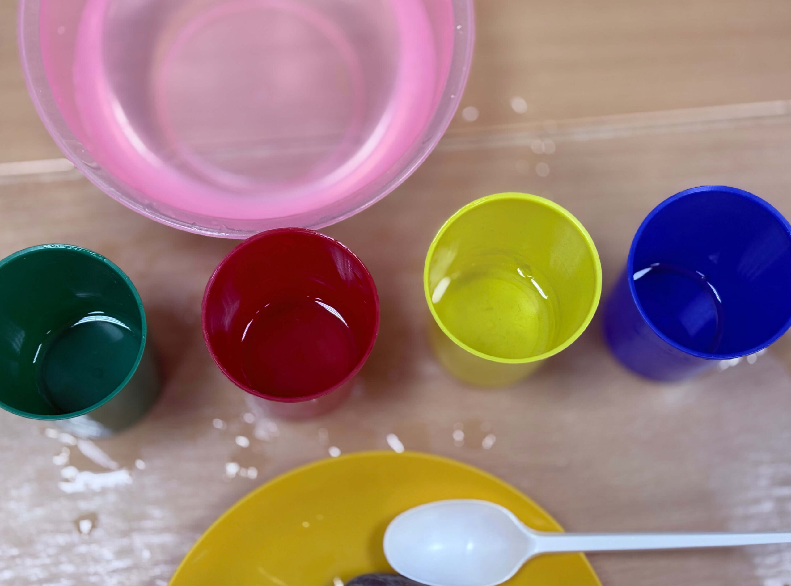2. «Радуга в стакане». Окрашиваем воду стаканах в разные цвета. Какая теперь вода? Она перенимает цвет растворенной краски. Вода – растворитель. Заодно повторяем названия цветов и оттенков.